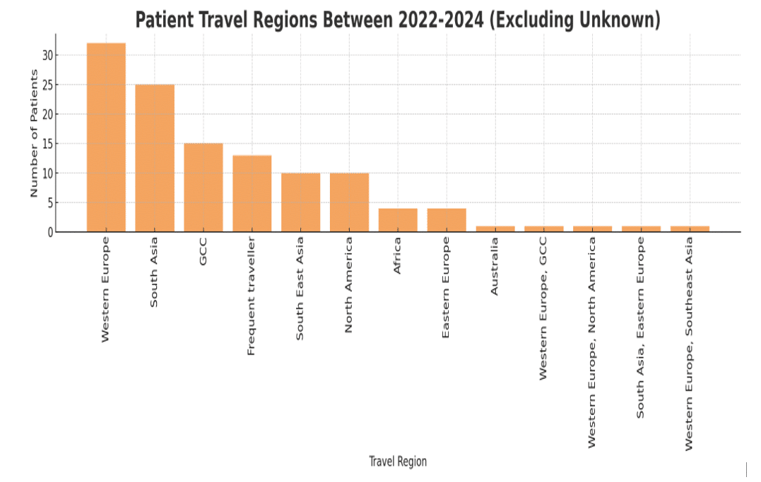 Regional breakdown of patients: Figure 3 illustrates the geographic distribution of the 213 patients (excluding the 272 with unknown travel data) who returned from international destinations over the past three years. Each bar represents the number of patients whose most recent trip fell into that region group.