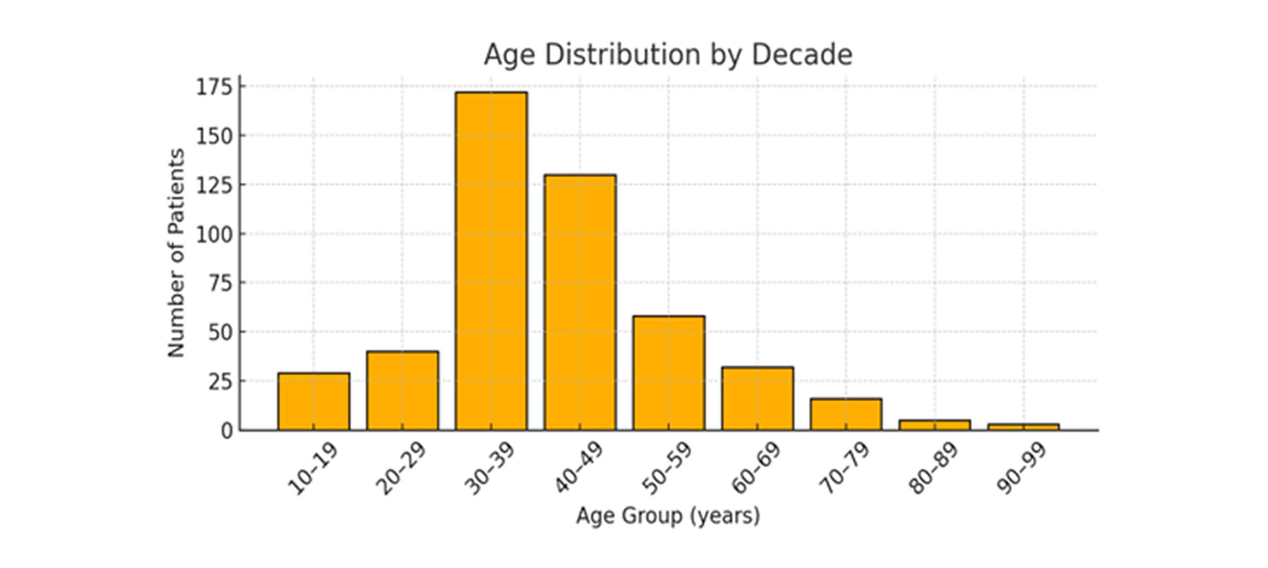 Age distribution across decades: The full cohort of 485 patients is partitioned into ten-year age brackets to illustrate the overall sample structure. Figure 2 presents a bar chart where each bar’s height corresponds to the number of individuals in that decade.