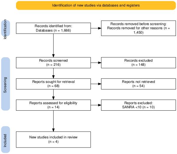 The remaining 14 full-text articles were evaluated for eligibility. Of these, 10 studies were excluded due to a scale for the assessment of narrative review articles (SANRA) score of <10, indicating insufficient quality. Ultimately, four studies met all inclusion criteria and were included in the final review.