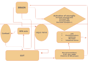 Microbiota and Neurodegenerative Diseases: The neurodegenerative diseases, such as Alzheimer’s and Parkinson’s disease, have been associated with imbalances in the gut microbiota. The neuronal inflammation, protein aggregation, and neuronal damage are associated with specific bacterial strains and microbial metabolites [6,10]. Scheperjans et al. [6] compared the gut microbiota composition between healthy controls and Parkinson’s disease patients and concluded that there is a difference in composition of the gut microbiota between these individuals and suggested a potential role of the microbiota in disease susceptibility. According to Agahi et al. [11], probiotics improve cognitive function in individuals with mild cognitive impairment. A study has suggested that the ecological balance of gut flora regulates neurotropic factor expression. It has also been shown that gut flora is involved in regulating the microbiota-gut-brain (MGB) axis and suppressing inflammation [20].