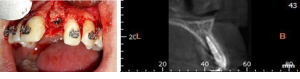 Figure 1 and 2: Photo showing the volume loss in the buccal side and cross-sectional image measuring the bucco-lingual thickening of residual bone