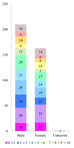 There was a total of 374 cases fitting the required criteria for this study. Out of these, the cancers were listed according to morphological and topographical classifications. The frequencies of childhood cancers according to their morphology, shown in Table 1, revealed that together, the top 5 cancers account for over 75% of cancers in children. According to their topography, the most common cancers were in the hematopoietic and reticuloendothelial systems (32.9%), urinary tract (12.8%), lymph nodes (8.3%), brain (7.5%), and bones, joints, and articular cartilage (6.4%). These results are displayed in Table 2. Out of a total of 50 cases of complex mixed and stromal neoplasms, 37 were mesoblastic nephromas and nephroblastoma, 9 were hepatoblastomas, 3 were clear cell sarcomas of the kidney, and 1 case was embryonal sarcoma (Figure 1). Out of a total of 41 cases of Neuroepitheliomatous Neoplasms, 24 were neuroblastomas, 13 were retinoblastomas, 3 were ganglioneuromas, and 1 case was atypical teratoid/rhabdoid tumor (Figure 2). The ratio of male to female cases was 210:163 (Figure 3). Regarding the distribution of the cases among different cities in Kurdistan, 79% were from Erbil, 11% from Duhok, 6% from Kirkuk, 3% unlisted, and 1% from Al Sulaimanyia (Figure 4). The number of cancer cases diagnosed increased from 34 in 2015 to 47 in 2016, followed by a significant spike to 105 in 2017. However, the number of diagnosed cases drastically dropped to 11 in 2018, before rising again to 84 cases in 2019 (Figure 5).