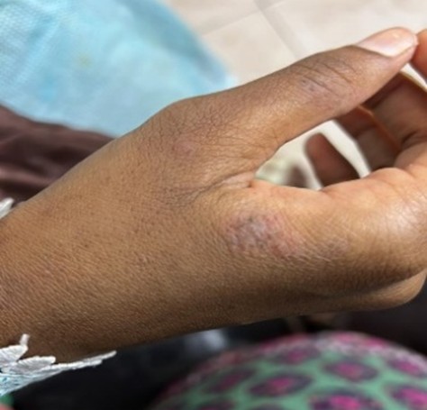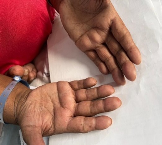 Figure 2: Hyperkeratosis, peeling, and cracks in the mechanic’s hand