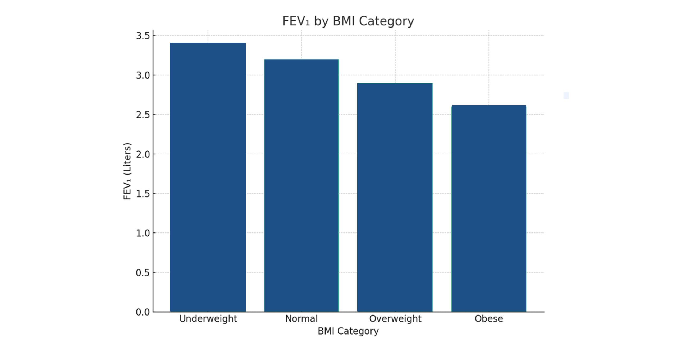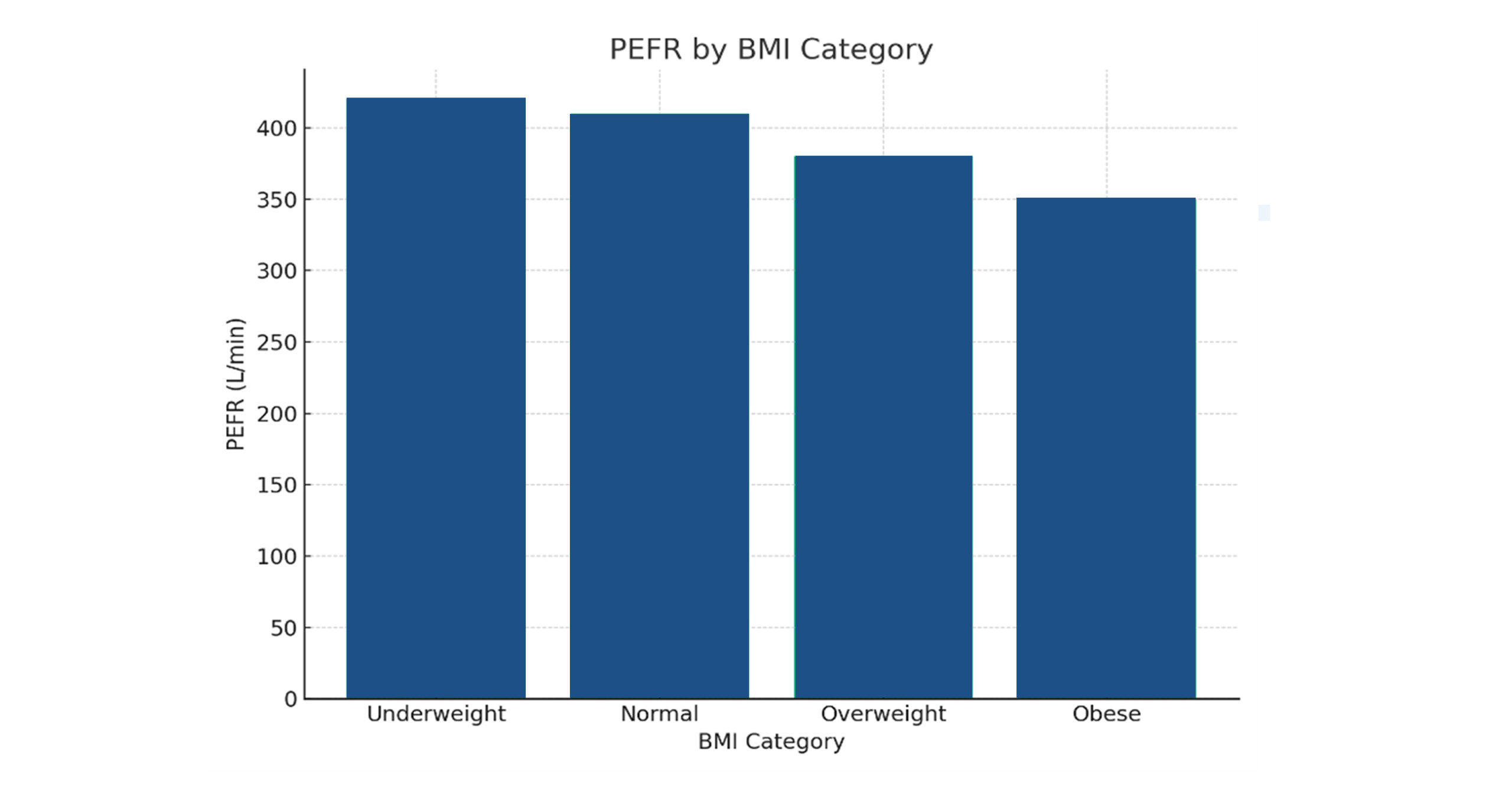 - Increasing BMI was associated with reduced FEV₁ and PEFR values.