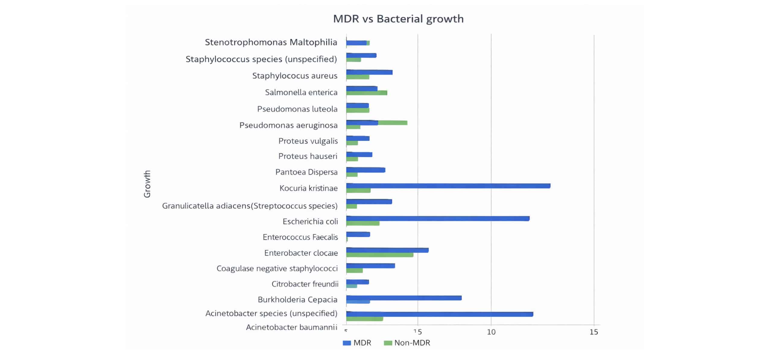 Furthermore, carbapenem resistance was completely accounted for by Acinetobacter baumannii, K. pneumoniae, and E. coli. In addition to that, all carbapenem-resistant isolates were MDR strains. This complete overlap between carbapenem resistance and multidrug resistance raises the concern of the possible presence of OXA-23-producing A. baumannii and horizontal gene transfer.[25] And considering the well-documented ability to transfer antimicrobial resistance capability genes both within and across species with nearly all methods of gene transfer, in some cases even occurring across domains, it poses the risk of further development of MDR strains. This would be very concerning as it could potentially lead to the further development of highly resistant bacteria. [22]
