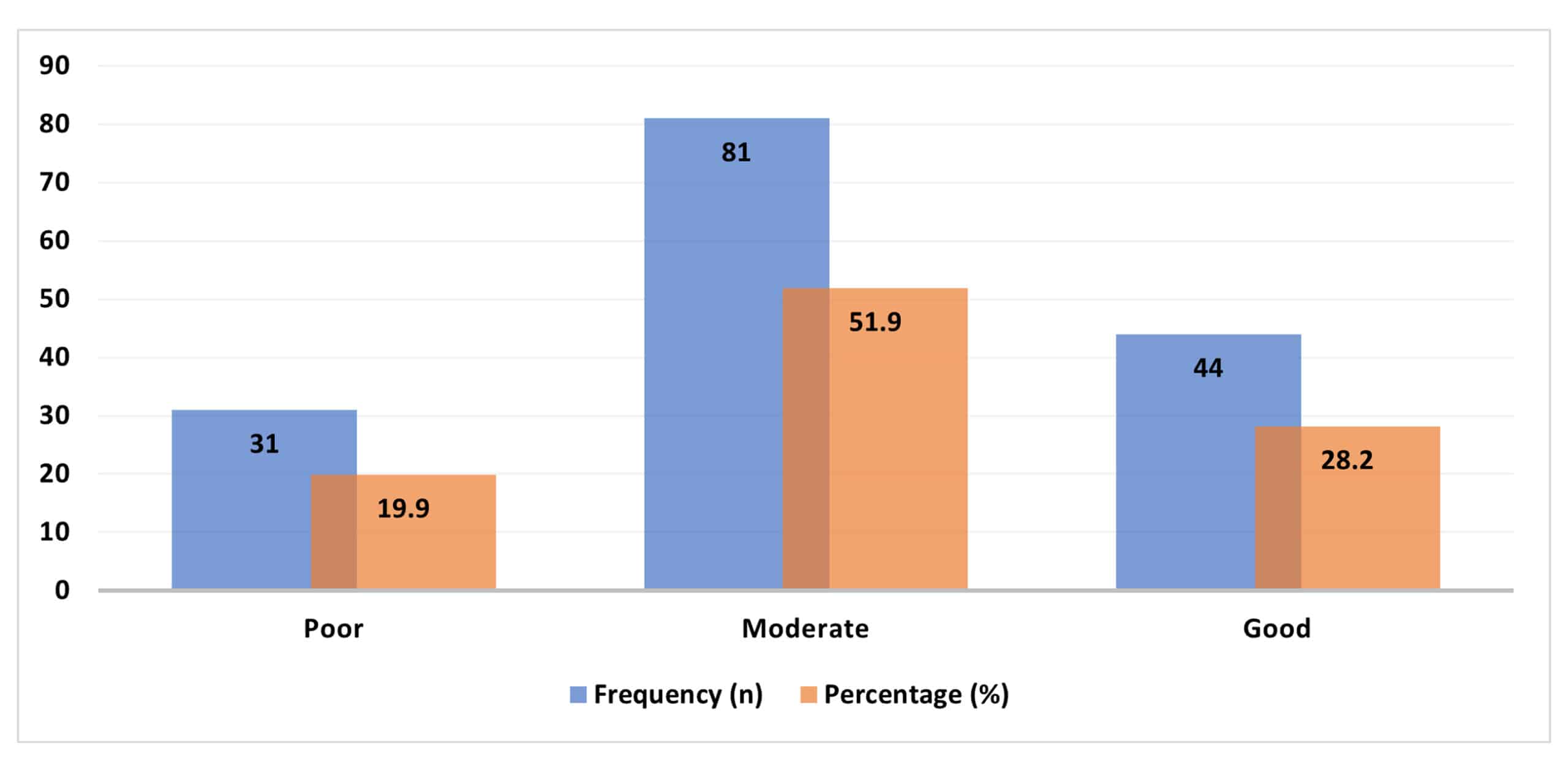 Figure 3 indicates the degree of evidence-based compassionate nursing care among nurses. Over half of the participants (51.9) represented moderate levels of compassionate care. Compassionate care was reported by 28.2% of the nurses with good levels. Almost one-fifth (19.9) had poor compassionate care practices. The findings show an opportunity to advance the field of evidence-based compassionate care.