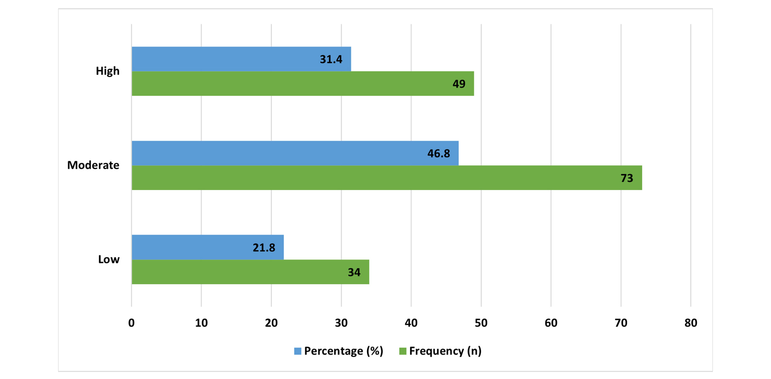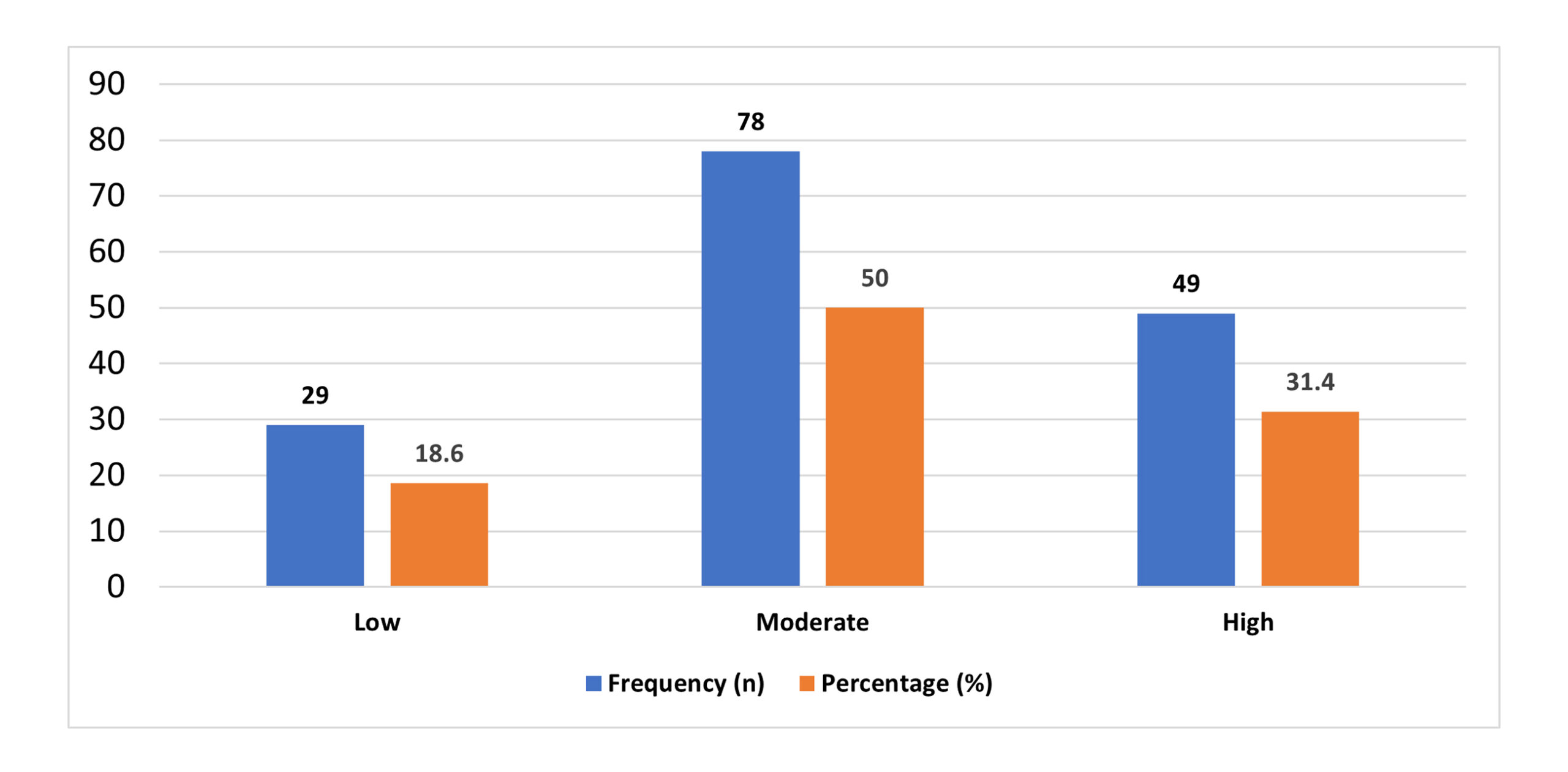The burnout levels of the study participants are presented in Figure 2. Nearly 50% of the nurses (46.8%) reported a medium level of burnout. The respondents with high burnout were 31.4%. Burnout among nurses was low at only 21.8. These results indicate that burnout is a common problem in the research environment.