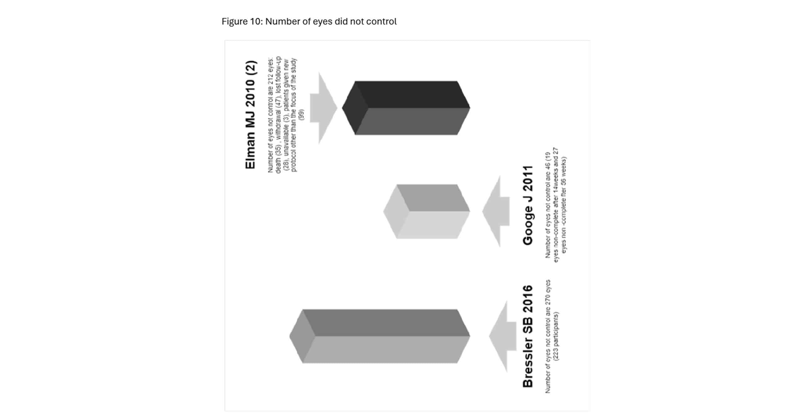 The fifth study included in the analysis involved 345 eyes and investigated treatments for DME from a 14-week to 56-week visit. This study also reported adverse events observed during follow-up, contributing to the safety profile of the treatments studied.[4]