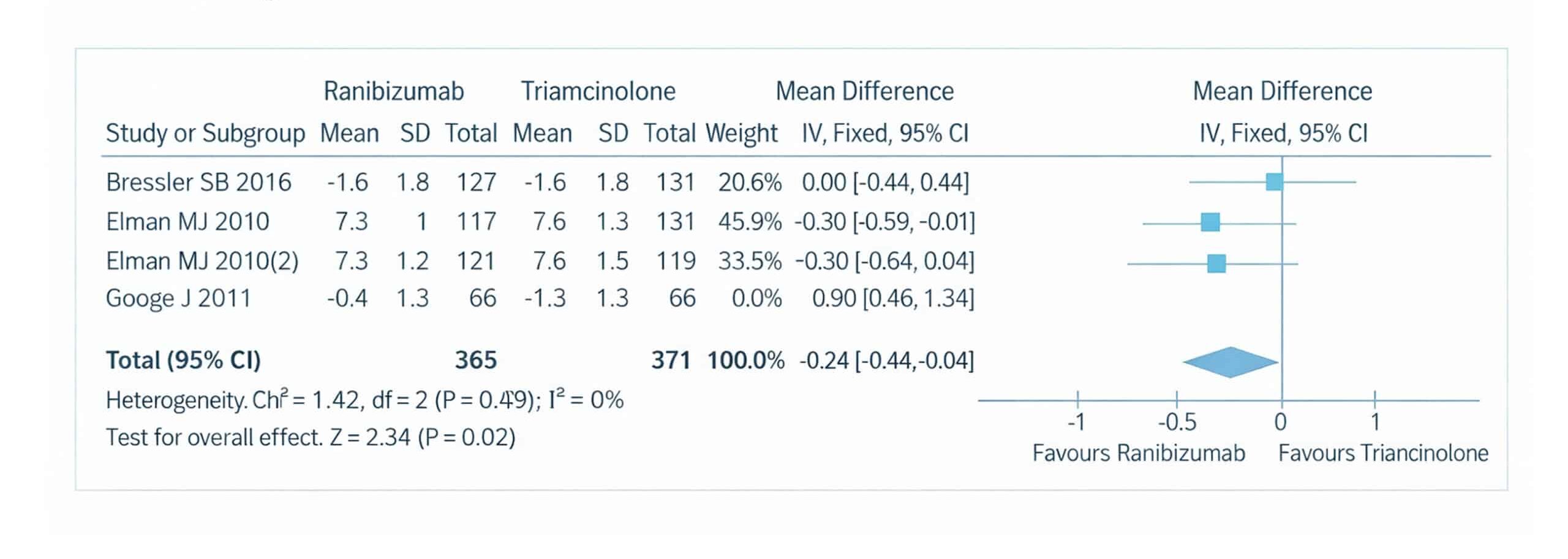 The IV method and a random-effects model were used to calculate the pooled mean differences, ensuring that the analysis accounts for any between-study variability. The weight assigned to each study in the meta-analysis was determined by its sample size and variance, ensuring that larger, more precise studies had a greater influence on the overall outcome. The heterogeneity of the studies was assessed using the Chi² test, which yielded a p-value of 0.002 and an I² of 4%, indicating no significant heterogeneity across the studies. This suggests the results were consistent and that the differences in visual acuity outcomes between ranibizumab and triamcinolone were not due to random variation.