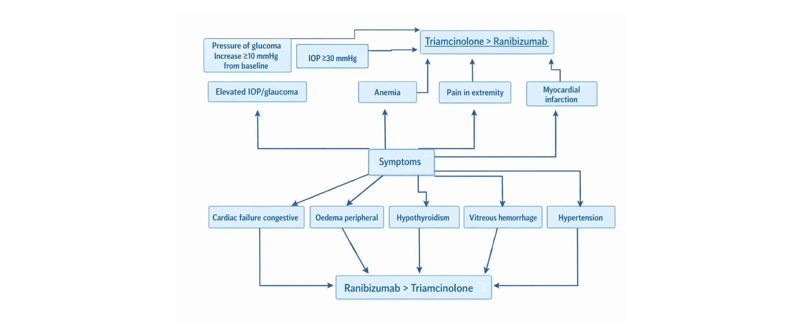 This comparison highlights the differing safety profiles of ranibizumab and triamcinolone, providing important considerations for clinicians when choosing treatment for DME based on patient-specific risk factors.