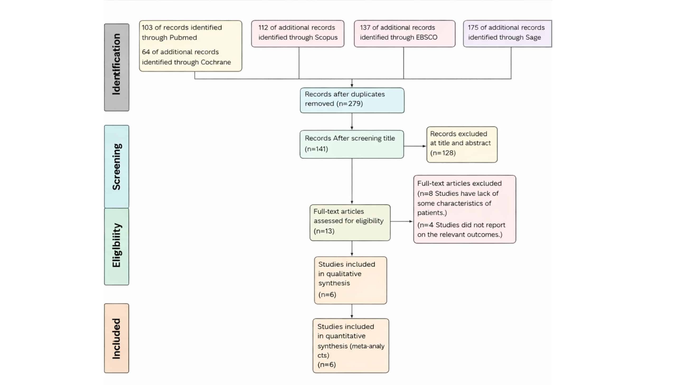 PRISMA flow diagram provides a detailed account of the selection process for the systematic review and meta-analysis on the use of ranibizumab compared to triamcinolone in the management of patients with diabetic macular edema. The initial search yielded a total of 591 records from various databases, 103 records from PubMed, 112 records from Scopus, sixty-four records from Cochrane, and 312 additional records identified through other sources (Sage and Ebsco). After removing duplicates, 273 records remained for further evaluation. The screening process began with these 273 records, from which 128 were excluded for focusing on other interventions or being irrelevant to the research question (title and abstract). This exclusion left 128 records for title screening. Following this, 7 more records were excluded for various reasons: 4 due to re-excision rate not being among the outcomes,3 due to a lack of some characteristics of patients. 13 full-text articles were assessed for eligibility, and 6 studies met the inclusion criteria. These 6 studies were subsequently included in both the systematic review and the quantitative synthesis (meta-analysis). This thorough selection process underscores the rigorous methodology employed to ensure the relevance and quality of the studies included in the review, thereby strengthening the reliability of the review’s findings on ranibizumab compared to triamcinolone in the management of patients with diabetic macular edema.