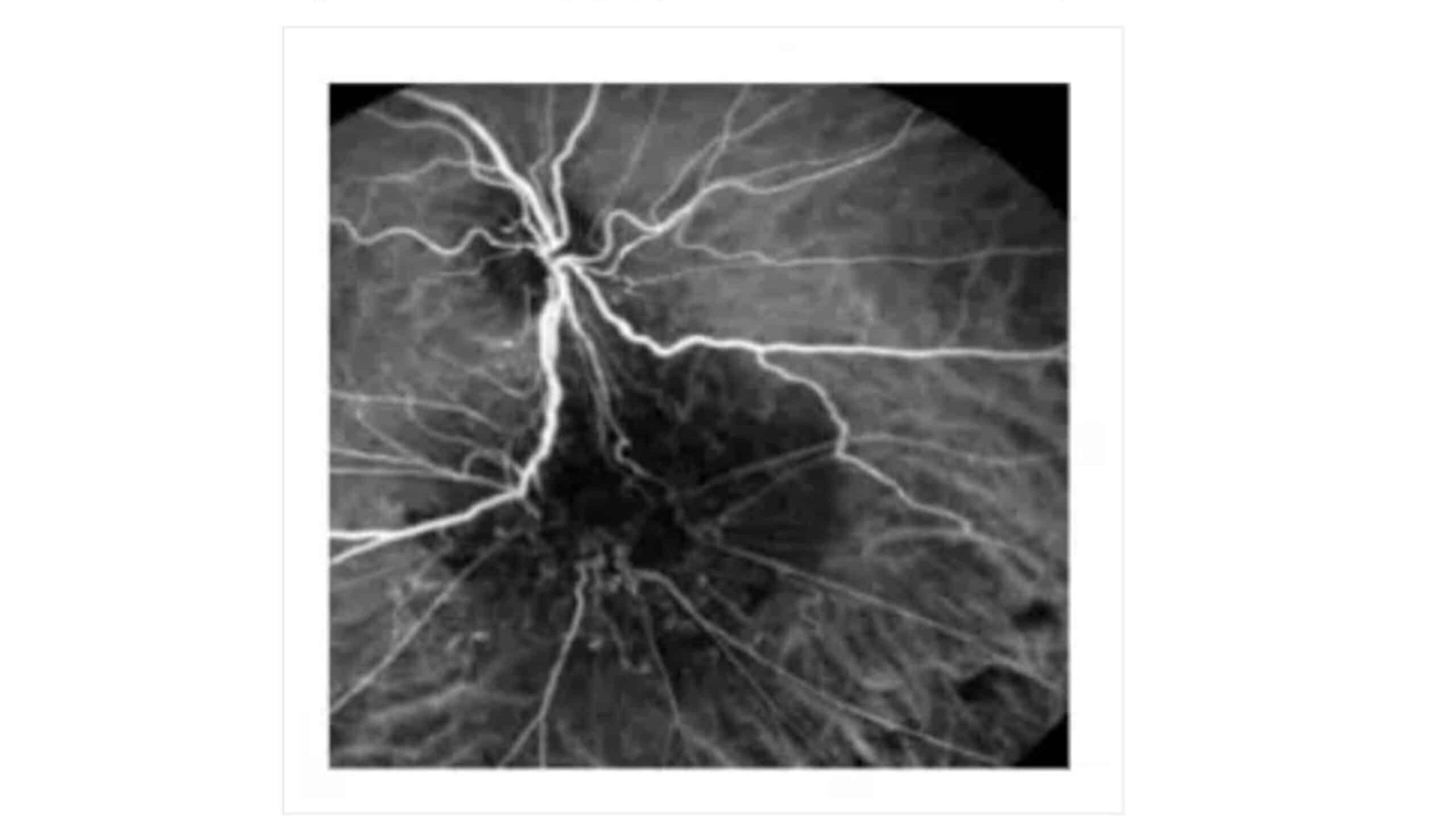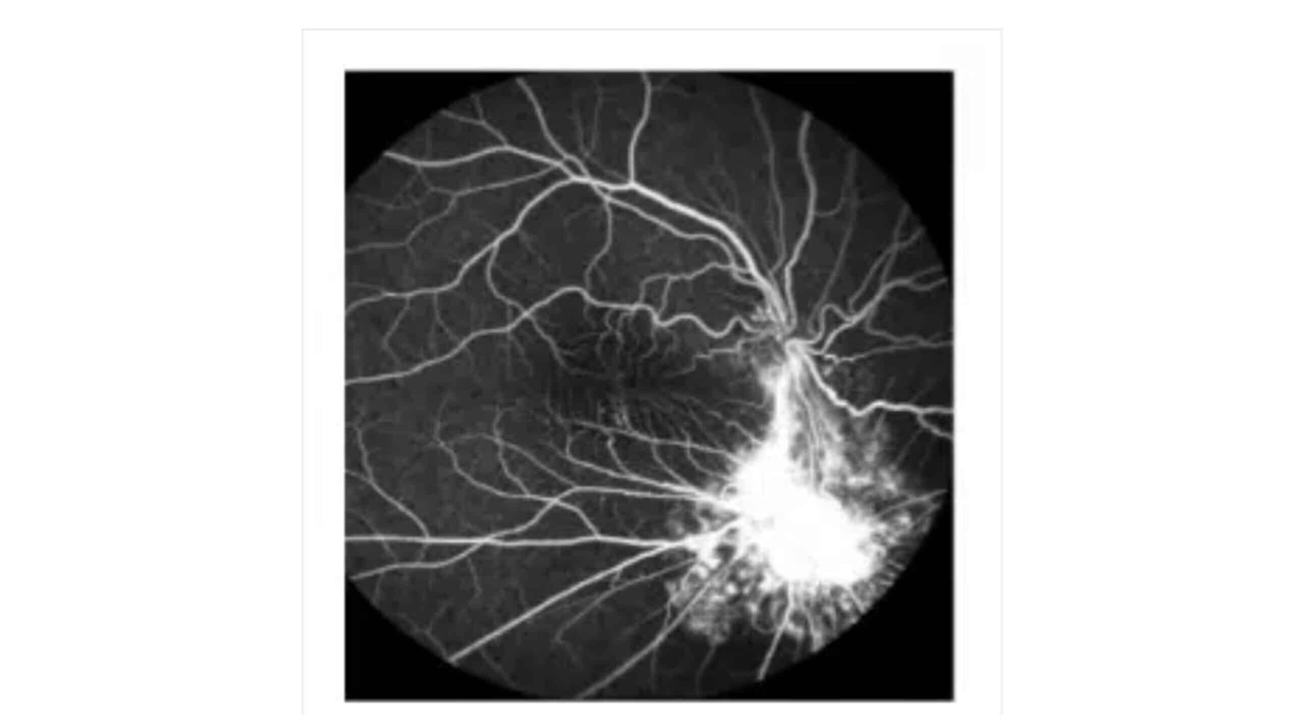 Figure 6: Fluorescein angiography. Twisted blood vessels below the optic