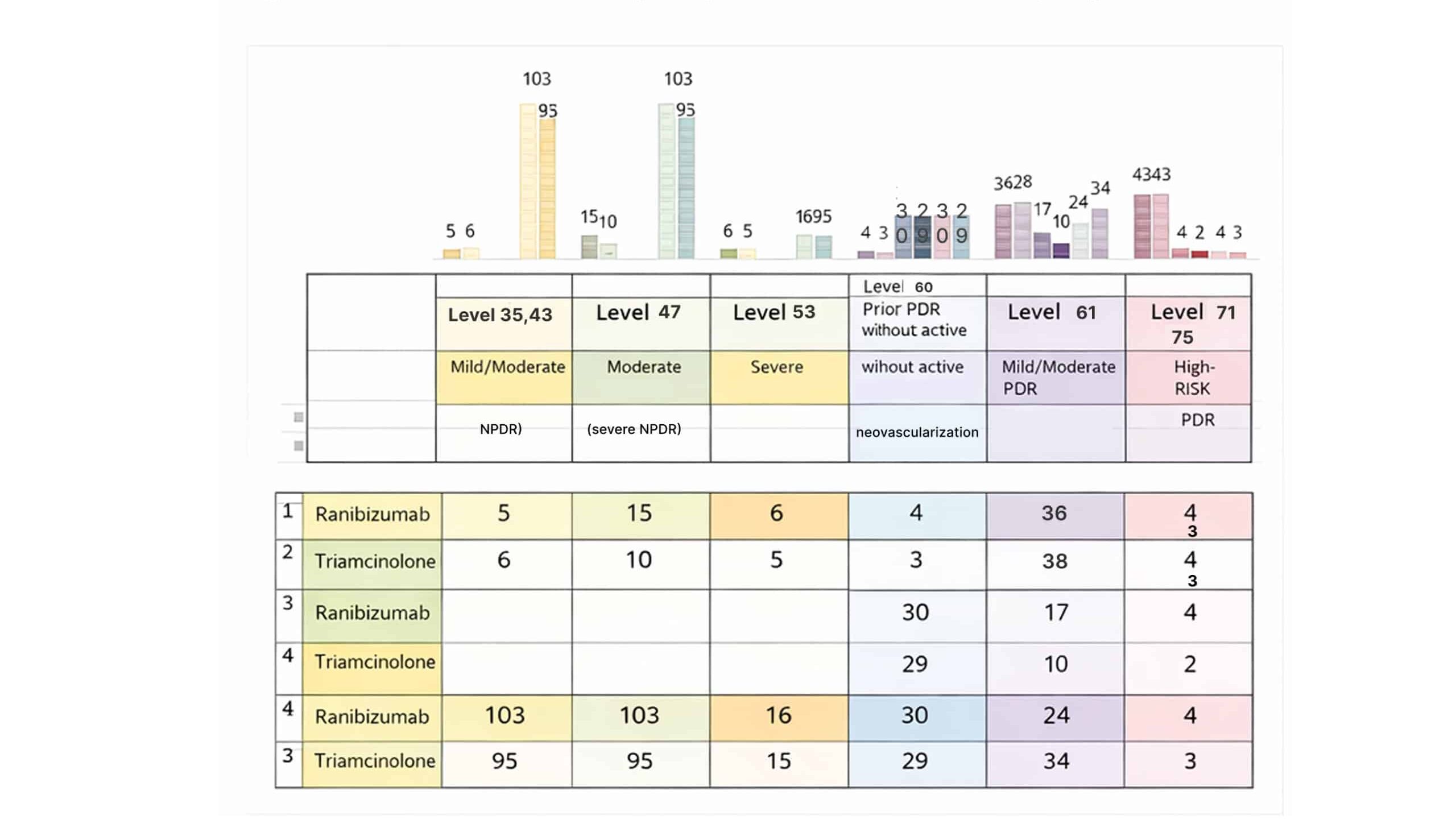 In the first group, 36 patients got ranibizumab and 38 got triamcinolone. Showing an almost equal use. However, in the second group, 8 patients received triamcinolone, while only 1 patient received ranibizumab. In the third study, 24 patients got ranibizumab and 34 got triamcinolone, demonstrating a slightly stronger preference for triamcinolone at this stage. At levels 71 and 75, these levels are for high-risk PDR where new blood vessels are more of a problem. In the first group, both treatments were used equally, with 43 patients each for ranibizumab and triamcinolone. So, there is an equal preference. In the second group, 4 patients got ranibizumab and 2 got triamcinolone. Even with smaller numbers, it seems that ranibizumab is still preferred a bit more. In the third study, the numbers remain like the first, with 4 patients on ranibizumab and 3 on triamcinolone, confirming a continued preference for ranibizumab at higher-risk stages, though it is not a major difference.