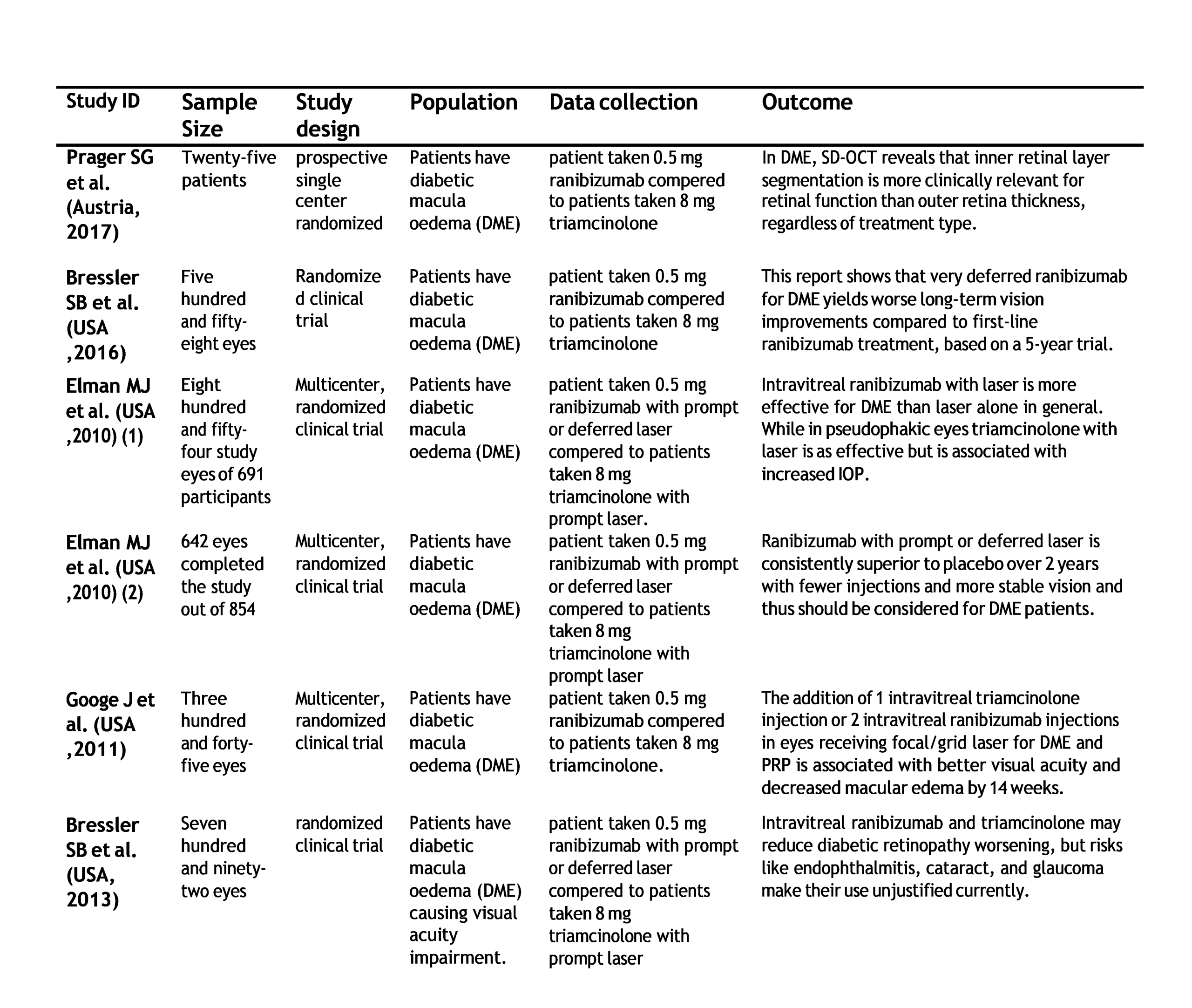 Table 1: Summary of the six studies compared (ranibizumab vs triamcinolone) in patients with DME