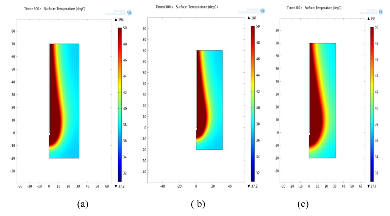 Figure 2: Temperature distributions using a monopole antenna with a radiating length of 8mm at a microwave power input of 10 W. The isotherm at 50 ºC is highlighted. (a) at 5.44GHz (b) at 6.02GHz (c) at 6.61GHz