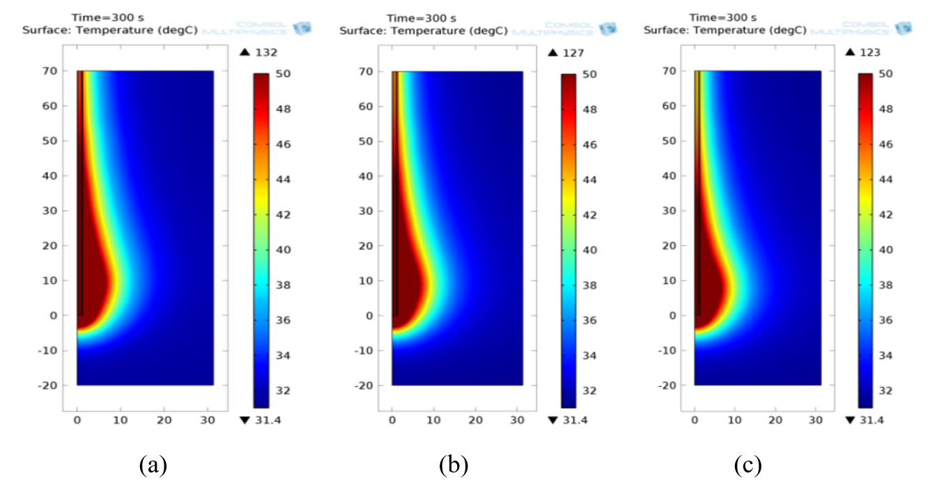 Figure 8: Necrotic tissue using monopole antenna with radiating length 10mm at (a) 4.18GHz (b) 4.76GHz (c) 5.44GHz