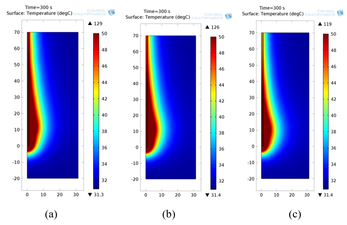 Figure 3: Temperature distributions using a monopole antenna with radiating length 10mm at a microwave power input of 10 W. The isotherm at 50 ºC is highlighted. (a) at 4.18GHz (b) at 4.76GHz (c) at 5.44GHz