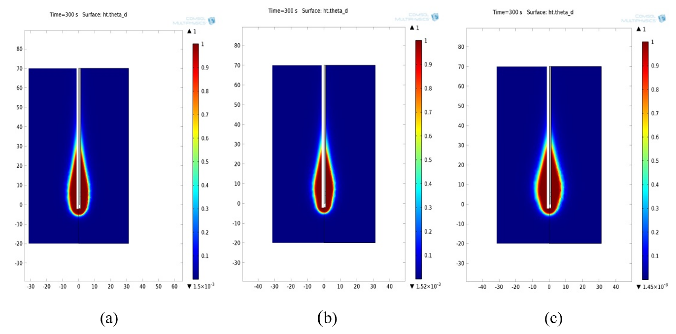 Figure 9: Necrotic tissue using monopole antenna with radiating length 13.5mm at (a) 3.30GHz (b) 3.59GHz (c) 3.88GHz