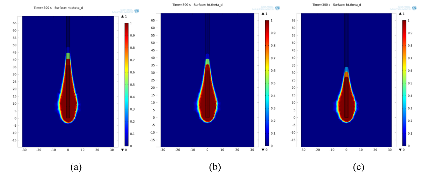 Figure 7: Necrotic tissue using monopole antenna with radiating length 8mm at (a) 5.44GHz (b) 6.02GHz (c) 6.61GHz