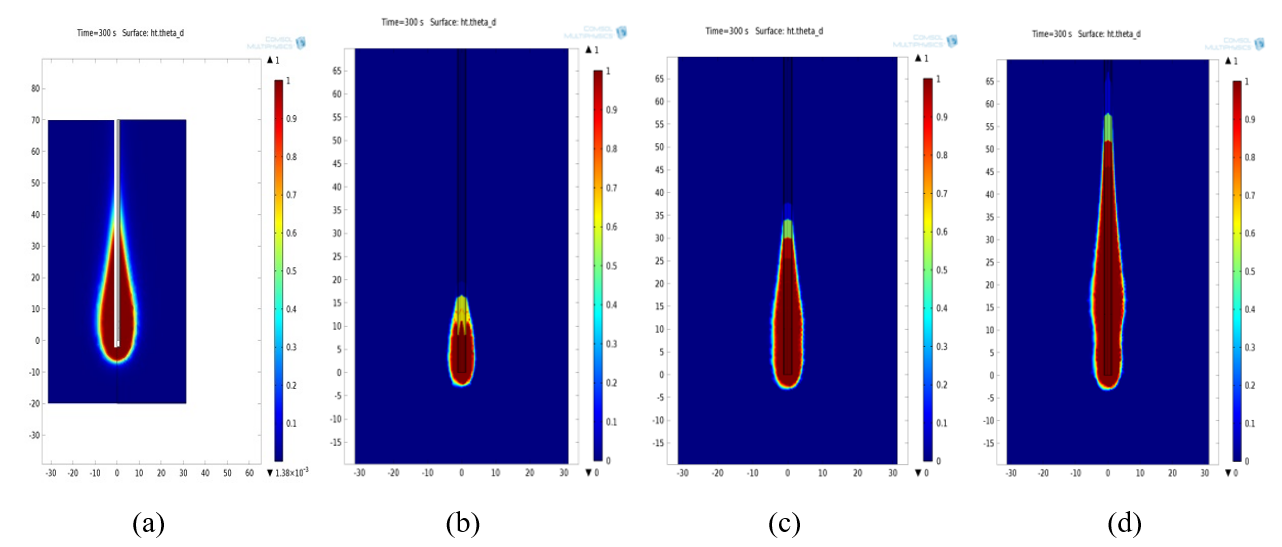 Figure 5: Temperature distributions for 2.45 GHz using (a) single slot antenna and monopole antenna with radiating length (b) 8 mm (c) 10 mm (d) 13.5 mm