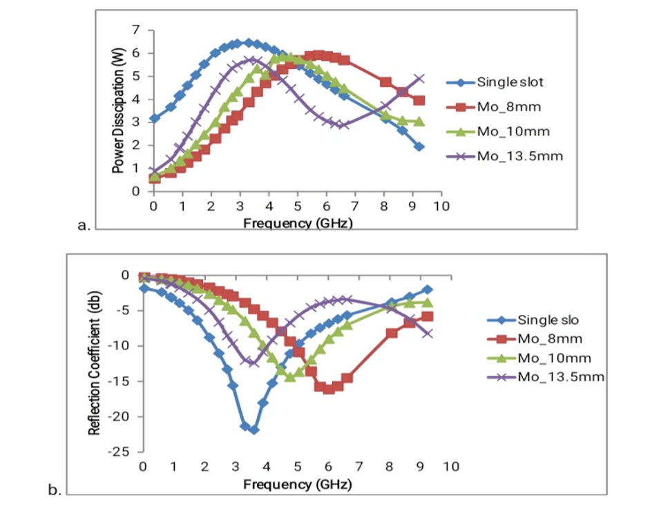 Figure 11: Comparison of power dissipations (a) and reflection coefficients (b) at variable frequencies with simulated microwave antennas