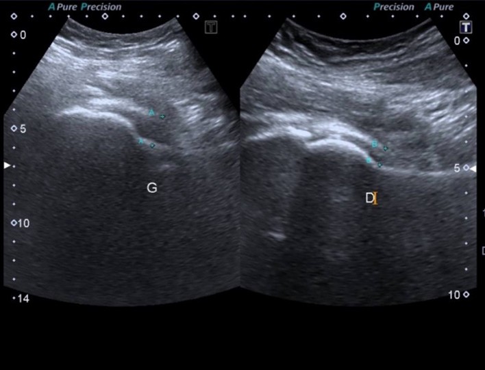 The initial laboratory findings: white blood cells (WBC) were 13.6×109/L (neutrophils: 11.83×109/L, lymphocyte count: 1.22×109/L), hemoglobin: 9 g/dL, normal glycated hemoglobin (HbA1c): 5.4%, platelet count: 81 ×109/L, erythrocyte sedimentation rate (ESR): 80 mm/hour and C-reactive protein (CRP): 12 mg/dL. Serum urea and creatinine were increased to 62 mg/dL and 1.8 mg/dL, respectively. Thyroid Stimulating Hormone was increased (TSH) at 6.6 mIU/mL (range: 0.35-5.1), normal free T4: 1.19 ng/dL (range: 0.5-1.4), normal free T3: 3.42 pg/ml (range: 1.8-4.2). The electrolytes and liver function tests were within normal range. The urinalysis showed bacteria 1+, red blood cells (RBC) > 100/HPF, WBC 38/HPF. In addition, the X-Ray of the left hip showed no bone/joint abnormality (Figure 3), whereas the ultrasound indicated an intra-articular collection around 16 mm (Figure 4).