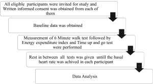 For the energy expenditure during walking, EEI was measured in which the participants were made to sit for 5 minutes; in the last 2 minutes of rest, the RHR was measured. Then she/he was made to walk for 5 minutes. In the last 30 seconds of the walk, WHR was measured.