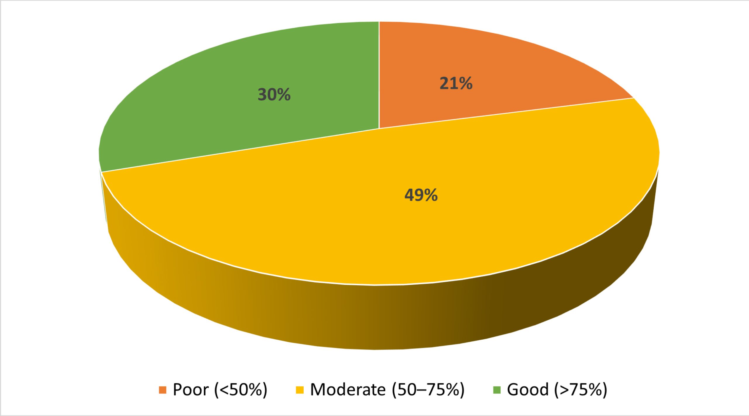 The knowledge assessment revealed that nearly half of the nurses (48.8%) demonstrated a moderate level of knowledge regarding chest tube management. About one-third (30.2%) showed good knowledge, reflecting adequate competency in practice. A smaller group (20.9%) scored poorly, indicating knowledge gaps that may increase patient risks. Overall, the majority of nurses possessed at least moderate knowledge levels.