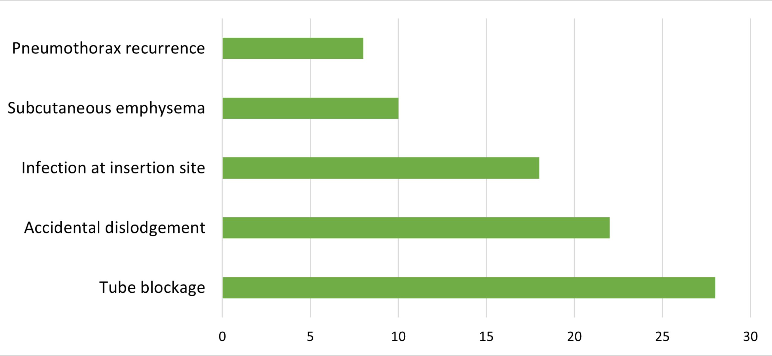 A significant percentage of complications were also found in the study, as tube blockage and accidental dislodgement were the most common. These observations are in line with Miranda FBG et al.[9] who established that invasive devices are often associated with mechanical complications that can be reduced in the case of attentive nursing care. In contrast, Waweru B et al.[15] have opined that systemic and patient-related factors, not necessarily those of nursing practice, may be the cause of infection-related complications, especially pleural effusions, due to which the outcomes should be evaluated by considering patient comorbidities.