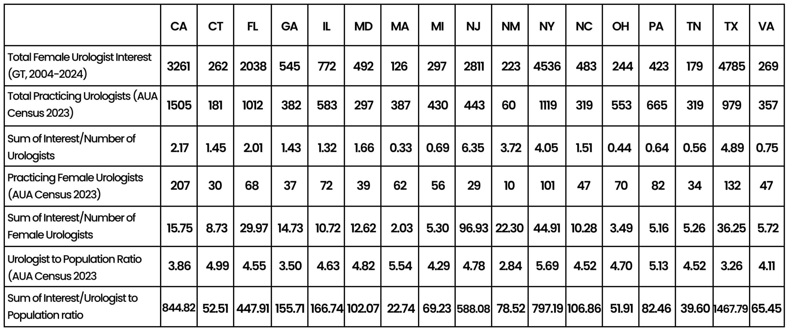 In general, the interest in the number of female urologists’ ratio is still higher in states with higher interest than those without, demonstrating a mismatch, where demand exceeds local workforce supply. This is especially pronounced in states such as New Jersey (96.9), New York (44.9), Texas (36.3), and Florida (30). The Sum of Interest/Urologist to Population ratio reflects the number of Google searches made for female urologists relative to the number of urologists in that state, adjusted for the population. Higher values in this ratio suggest a greater search interest for female urologists per capita, which can imply that there is an increased need for urologists in these states who meet the search criteria. Among the states with sufficient data, Texas, California, New York, New Jersey, and Florida have the highest demand ratio values.