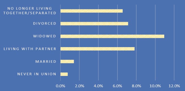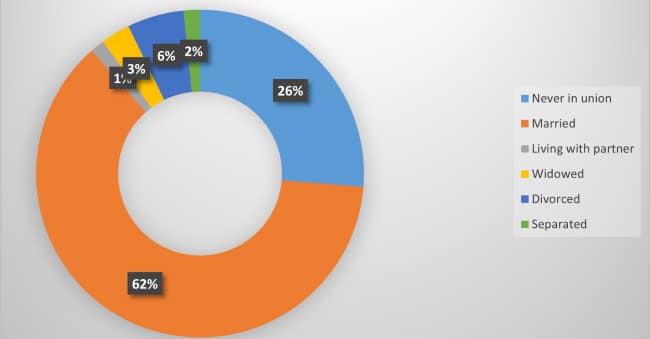 Majority of the respondents (62%) were married followed by those who have never been in marital union, 26% and divorced 6%.