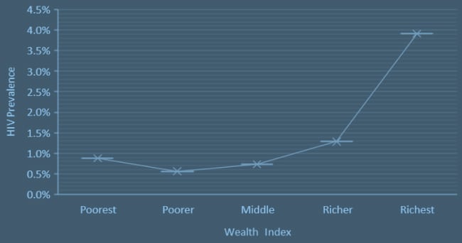 Study subjects’ economic status is sometimes hypothesized as a determining factor for HIV risk and vulnerability. This assumption usually applies to women in developing and least developed countries, given their economic vulnerability and engagement in risky sexual behavior as a result. With that understanding, the HIV prevalence rate across various wealth quintiles was assessed. As depicted in the line graph below, the HIV prevalence rate of women increases as their wealth quintile increases. This finding was not consistent with the conventional assumptions that poorer or poorest women are much more vulnerable to HIV. Further analysis of this finding using logistic regression showed that the odds of HIV positivity were lower 80%, 85%,82% and 68% among the poorest to richest, with the richest as the constant (reference wealth quintile), with statistical significance (p<0.001). This could be explained by the fact that rich women in the study were urban dwellers, where the background HIV prevalence was much higher (five times higher) than that of the rural residents. However, further study to explore why such higher vulnerability to HIV was associated among economically well-off women is very important.