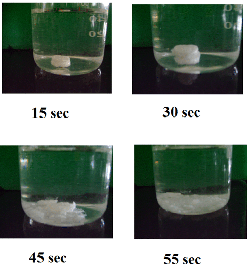 Wetting time: Wetting time is closely related to the inner structure of the tablets and to the hydrophilicity of the excipient. The initial process in the disintegration of an ODT involves water uptake and wetting of the tablet. So, determining the wetting time is also important. It also helps in studying the effect of various excipients on the disintegration of the tablet. A Petri dish containing 6 ml of distilled water was taken, and a tissue paper folded twice was placed in it. A tablet containing a small quantity of amaranth color was placed on this. Time required for the upper surface of the tablet to become completely red is the wetting time, and it was recorded.