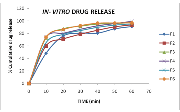 The dissolution profile of formulations (F1-F6) indicates a faster release of drug i.e., 90% or more of the drug released from all formulations within 60 mi. However, the maximum release of drug (99.4%) was observed in F4. This formulation also exhibited better performance in the other evaluation parameters. Hence, formulation (F4) is selected as an optimized formula.