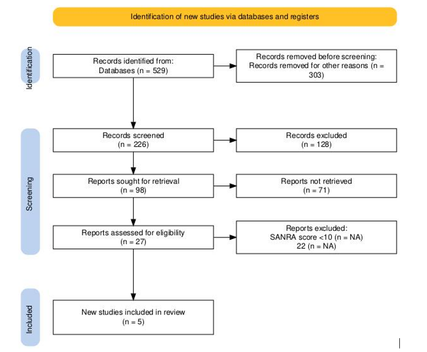 The 27 full-text articles were assessed for eligibility. Each report was evaluated using the SANRA scoring system. Studies scoring below 10 on the SANRA scale were excluded. A total of 22 reports were excluded at this stage due to insufficient SANRA scores. Finally, five studies met all inclusion criteria and were included in the final qualitative synthesis of the review.