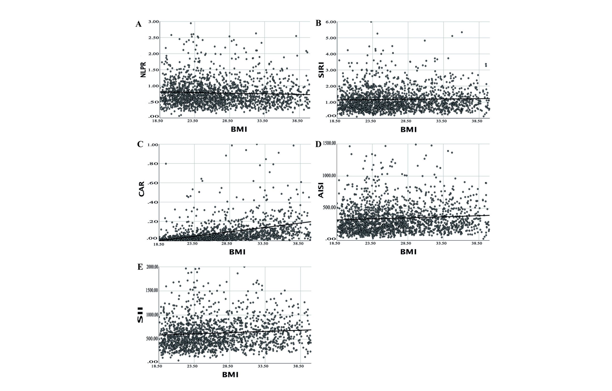 When the systemic inflammation indices were evaluated by BMI, only the CAR index was elevated in participants with OW/OB (1.86-fold increase, p<0.001, Table 2). Scatterplots demonstrated significant weak associations between BMI and NLPR (r=-0.033, p<0.001), SIRI (r=0.047, p<0.001), CAR (r=0.340, p<0.001), AISI (r=0.077, p<0.001), and SII (r=0.086, p<0.001, Figure 1. Using multivariate linear regression, increases in BMI were associated with increases in the CAR (estimate=0.008, p<0.001), AISI (estimate=4.487, p=0.007), and SII (estimate=7.491, p=0.001), when age, marital status, ethnicity, and PIR were considered (Table 3).