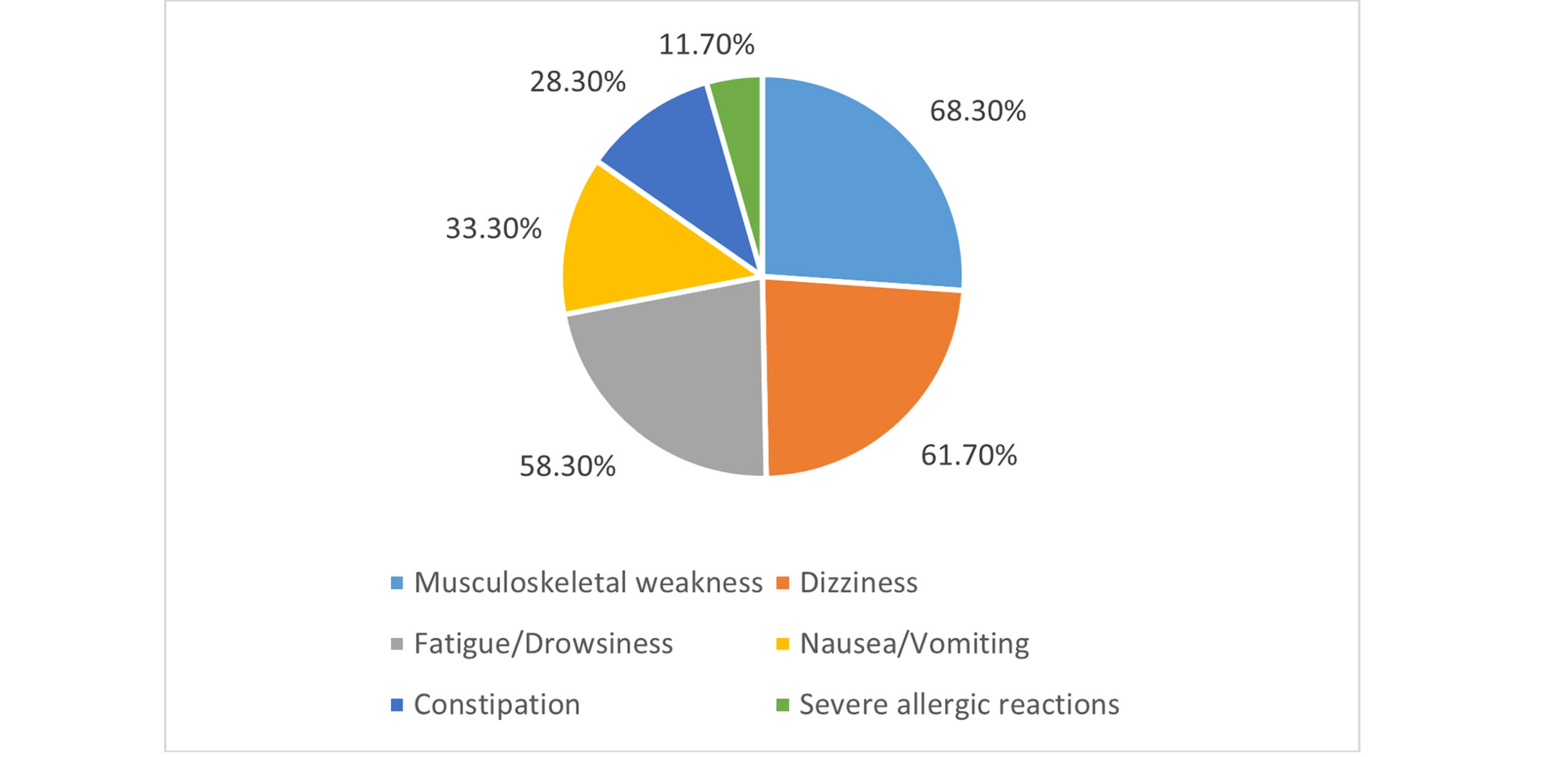 Previous research connects polytherapy and age to reduced tolerability of AEDS.[25,26] This is also consistent with our results, which identify age above 45 years (OR = 2.4, p = 0.018) and severe dizziness (OR = 3.1, p = 0.004) as predictors of discontinuation. Furthermore, our analysis showed that in addition to gastrointestinal concerns such as nausea/vomiting and constipation, musculoskeletal problems, especially muscle weakness, were very common. This notably high incidence of muscle weakness (68%) in our cohort contrasts with standard CNS-focused adverse event profiles reported in the literature (e.g., 80% CNS effects).[24] This may indicate variations in regional prescribing practices or differences in the methodologies used for symptom assessment.