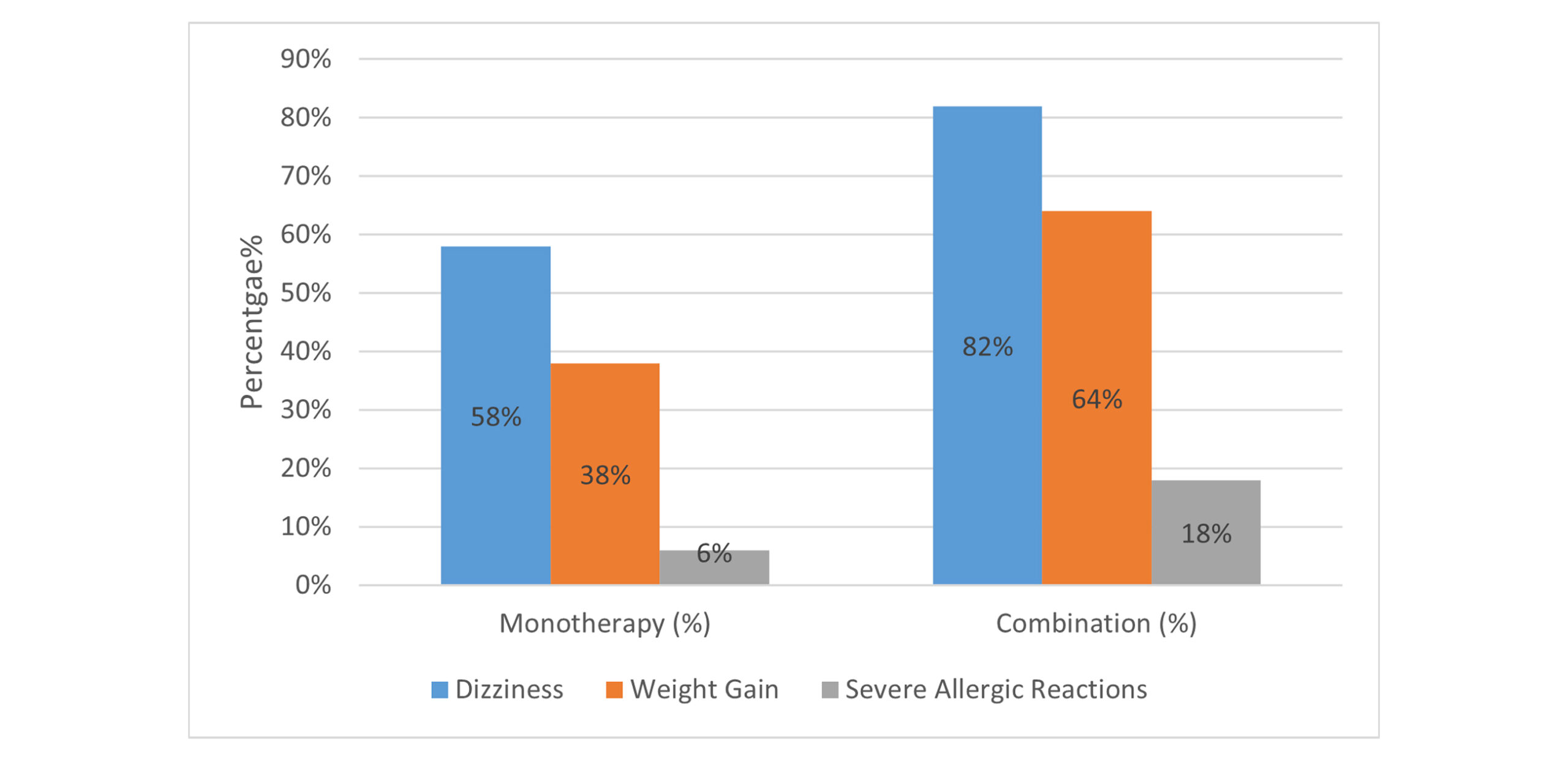 Prevalence of adverse effects in monotherapy vs. combination therapy: Table 5 summarizes the comparative analysis of the prevalence of the adverse effects associated with monotherapy vs combination therapy in the context of epilepsy management. The data indicates that the combination therapy is associated with markedly higher frequencies of dizziness (82% compared to 58%), weight gain (64% vs 38%), and severe allergic reactions (18% in contrast 6%) when juxtaposed with monotherapy, with each comparison yielding statistically significant p-values.