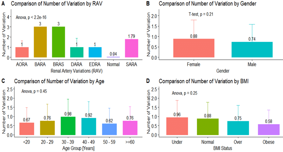The statistical analysis revealed no significant differences in the number of RAVs based on age, gender, or BMI (p > 0.05). However, the spectrum of renal arteries showed significant variability (p < 0.001), indicating that while the presence of RAVs is not influenced by these demographic factors, the type of variation may be. This is supported by findings from García-Barrios A et al.[24], who also reported significant variability in the types of RAVs among the population of the study. Further supporting the findings of this study, similar research has underscored the significance of considering anatomical variations, particularly in the renal arteries, in clinical practice. For example, a study by Mishra et al.[25] emphasized the critical role that understanding these variations plays in surgical planning and patient management, as well as the direct impact it can have on the success of various medical procedures. Furthermore, a better understanding of the environmental factors that contribute to RAVs could inform public health strategies aimed at minimizing risk factors during pregnancy or early development. This knowledge could also guide recommendations for preventive measures that might reduce the likelihood of developing complex renal artery variations, ultimately leading to improved patient outcomes.