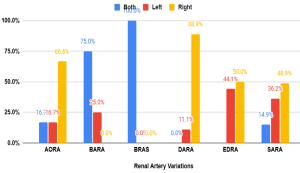 Gender differences in RAV were notable, with females showing a higher prevalence of AORA (3.6% in females vs. 1.4% in males) and BARA (5.4% in females vs. 1.4% in males). Males, on the other hand, exhibited a higher prevalence of DARA (5.0% in males vs. 1.8% in females) and EDRA (40% in males vs. 25% in females). These findings align with the results of a study by Elrahim[17], which also reported significant gender differences in renal artery anatomy. Such differences are crucial for personalized medical approaches and highlight the need for gender-specific diagnostic protocols. Such differences are crucial for personalized medical approaches and highlight the need for gender-specific diagnostic protocols.[18,19,20]