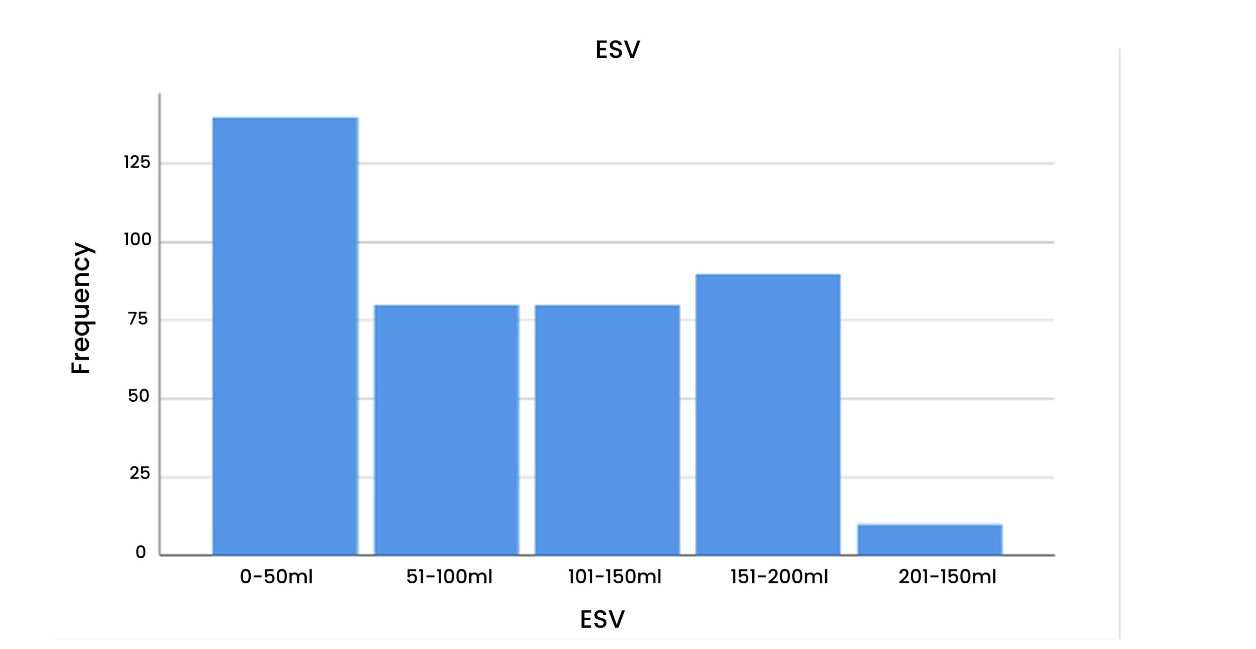 According to this, a maximum of 35% of the patients were between 0- 50ml. A minimum of 2% of the patients with ESV presented in 200- 250ml.