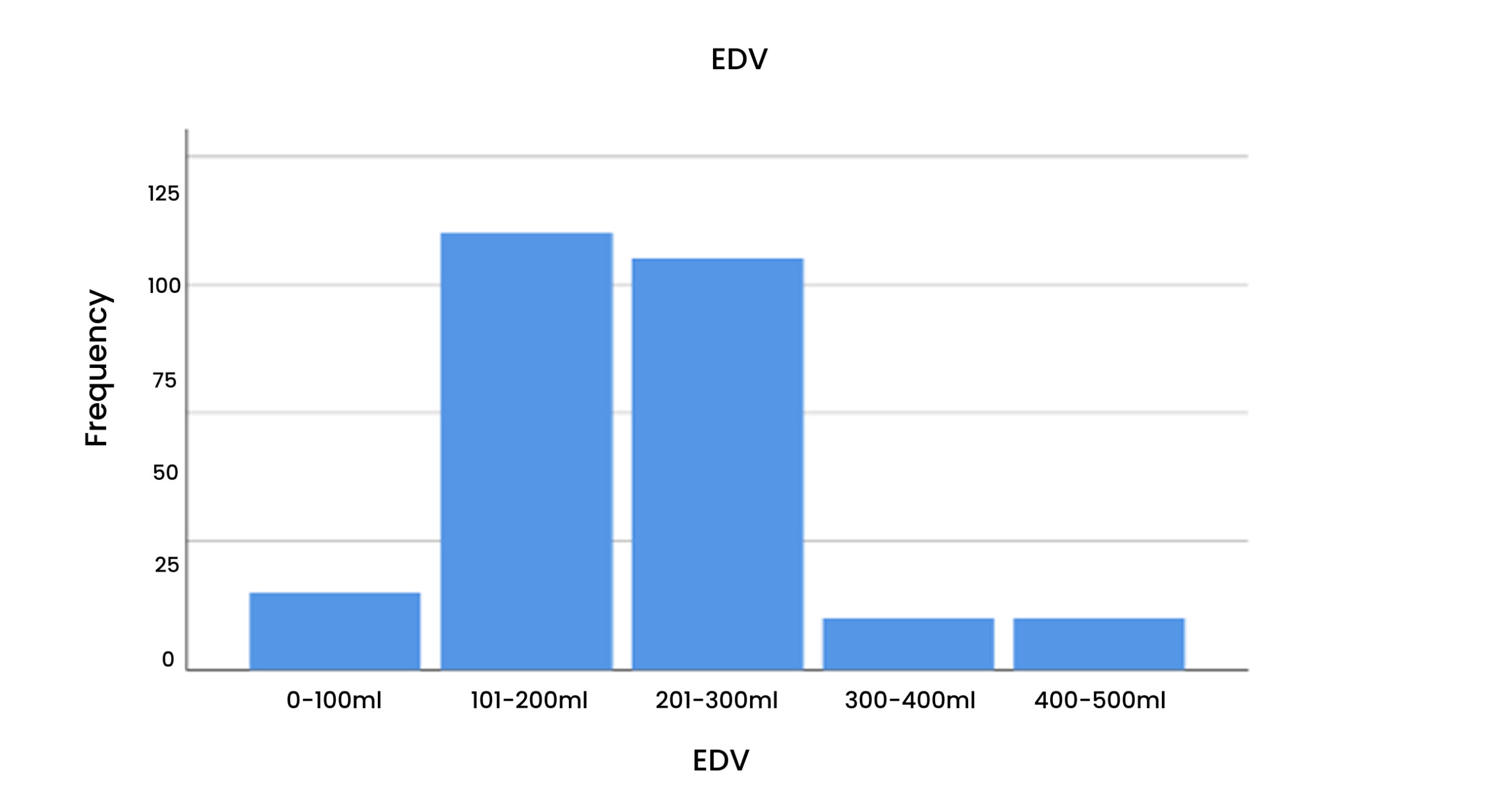 According to this, a maximum of 42.5% of the patients were between 100- 200ml. A minimum of 5% of the patients with EDV presented with 300- 500 mL.