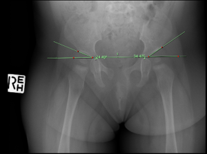 Figure 1: X-ray at 8M29D Showing Acetabular Angles Prior to Bracing