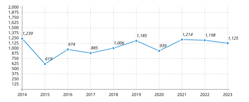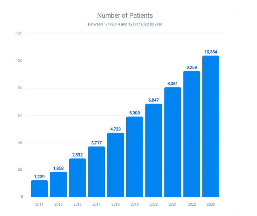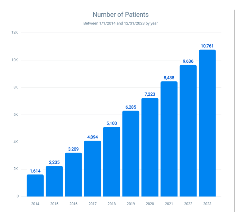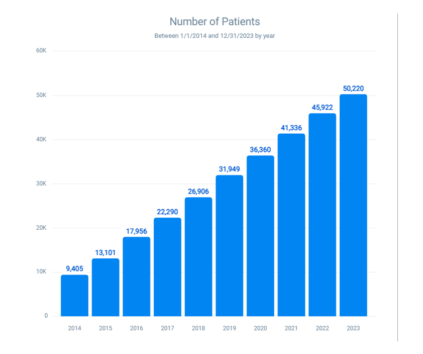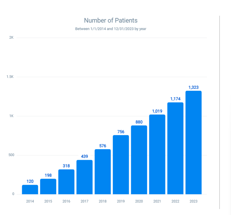 Combined latex and latex fruit allergies: The prevalence of patients with both latex and latex fruit allergies has surged from 120 in 2014 to 1323 in 2023 (Figure 6). This represents an approximate increase of 926.67%, or a 10.27-fold increase over the decade. This data indicates a critical rise in dual allergies, necessitating better diagnostic practices and management strategies to mitigate the risks of severe allergic reactions.