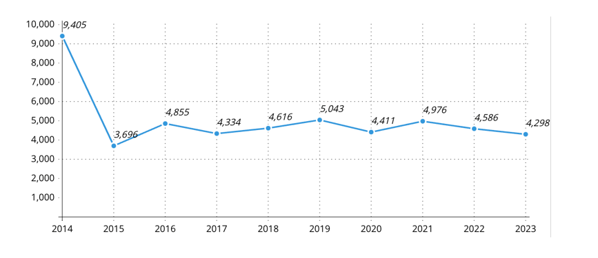 Specific allergies to latex-associated fruits and shellfish: The number of patients with combined allergies to fruits and shellfish rose from 1614 in 2014 to 10,761 in 2023 (Figure 5). This growth represents a 566.73% increase and a 6.67-fold increase over ten years. This trend suggests that individuals with latex fruit allergies may also be at risk for shellfish allergies.
