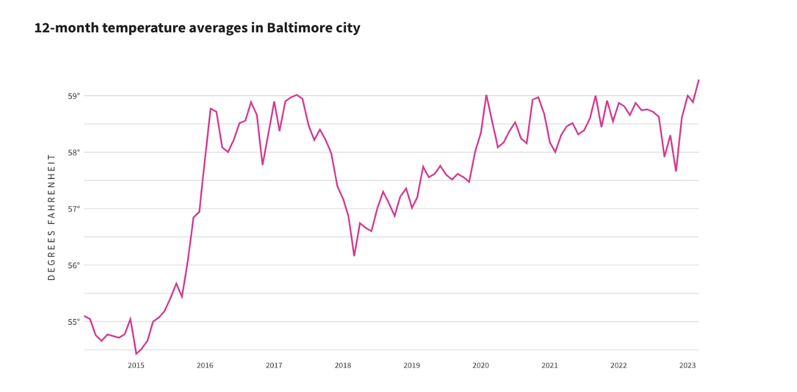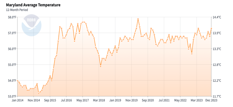 Baltimore and the state of Maryland have seen an increase in peak temperatures. The summer months have recorded higher maximum temperatures compared to a decade ago, reflecting a trend of increasingly hotter summers. The average annual temperature in Baltimore and the state of Maryland has also shown an upward trend. This aligns with global climate change patterns, where average temperatures are rising due to increased greenhouse gas emissions.[17]