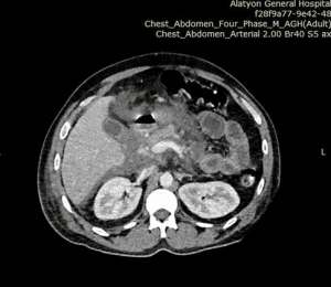 Upon examination, he is acutely sick looking in pain and with central obesity on general appearance, his blood pressure (BP) was 140/80 mmHg, a pulse rate of 108 beats per minute, a temperature of 36.3℃, a respiratory rate of 24 breath per minute, oxygen saturation on 90% on atmospheric air, and a body mass index (BMI) of 35 kg/m2. He had bilateral posterior basal third crepitation and decreased air entry, suggestive of reactive effusion. The abdomen was distended, and there was a hypertympanic note on the percussion, with tenderness over the epigastric and right lower quadrant area. There was no eruptive xanthoma.