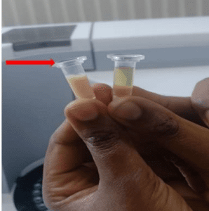 Figure 1: Lactescent serum sample of our patient (red arrow) compared with normal serum