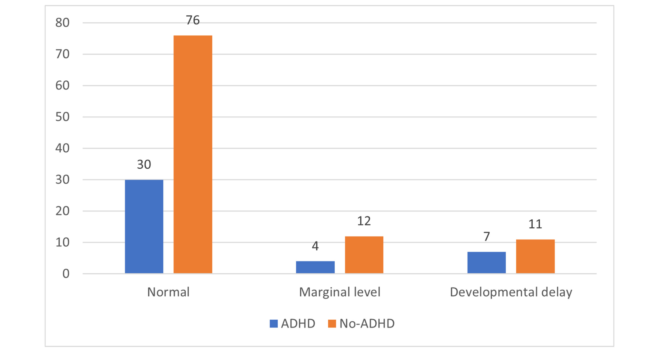 Comparative analysis of IQ Levels in Children with and without ADHD: Figure 3 compares IQ levels among children diagnosed with ADHD and those without the disorder. The bar graph illustrates three categories: Normal, Marginal Level, and Developmental Delay. The significant difference indicates a notable disparity in the proportion of children with normal IQ levels between the children with and without ADHD. In the normal IQ level category, 30 children with ADHD are reported, while a significantly higher number, 76 children without ADHD, fall into the other category.