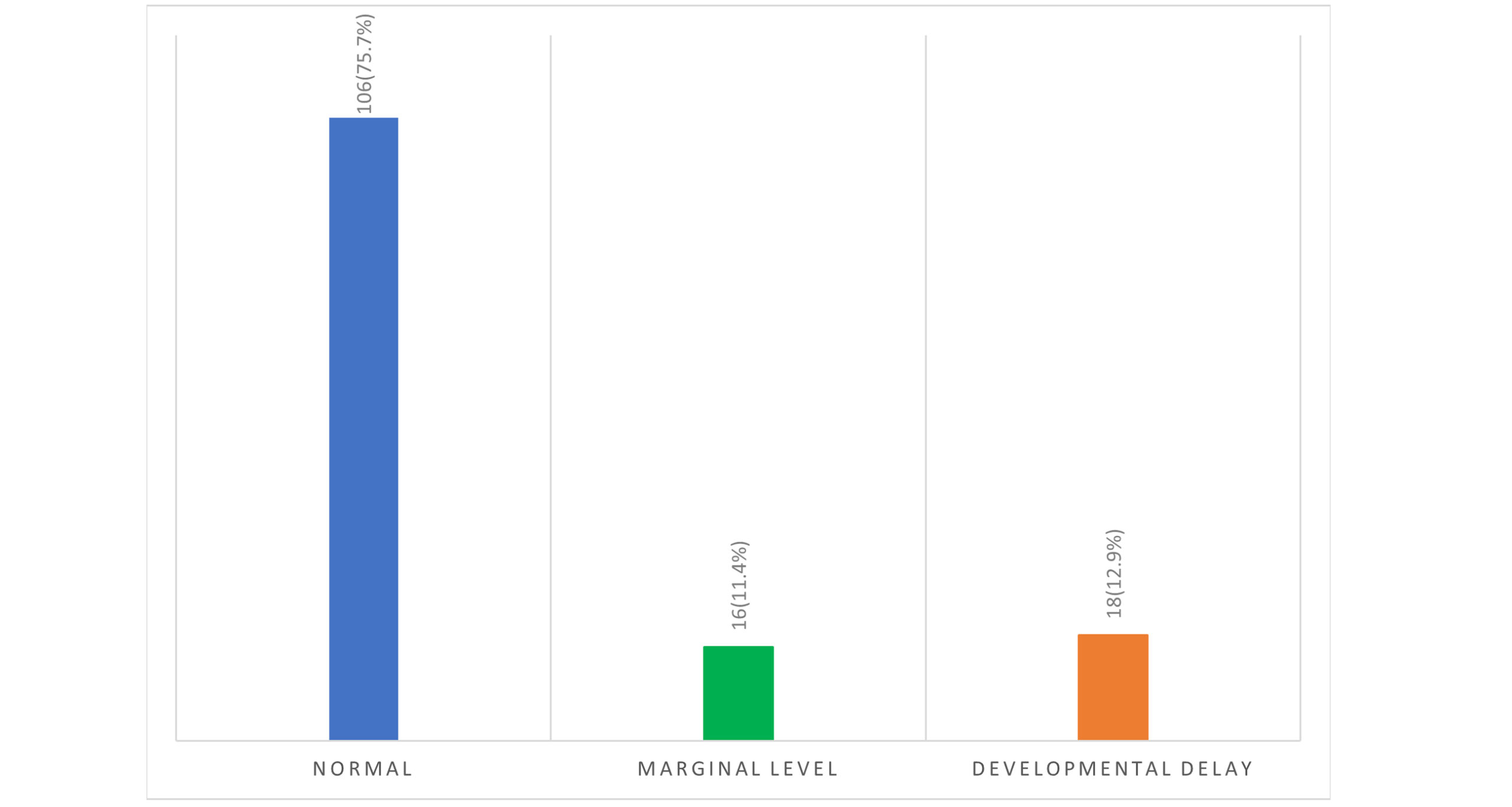 Distribution of IQ levels among children: Figure 1 presents the distribution of IQ levels among the children assessed in this study, categorized into three groups: normal, marginal, and developmental delay. Most children, 106 (75.7%), fall within the normal IQ range, indicating that a significant portion of the population assessed demonstrates cognitive abilities that are typical for their age group. A smaller proportion, 16 (11.4%), is classified at the marginal level of IQ, suggesting a performance level that is below average but not classified as a developmental delay. Finally, 18 (12.9%) of the children have developmental delays, indicating challenges in cognitive functioning that may require specialized attention.